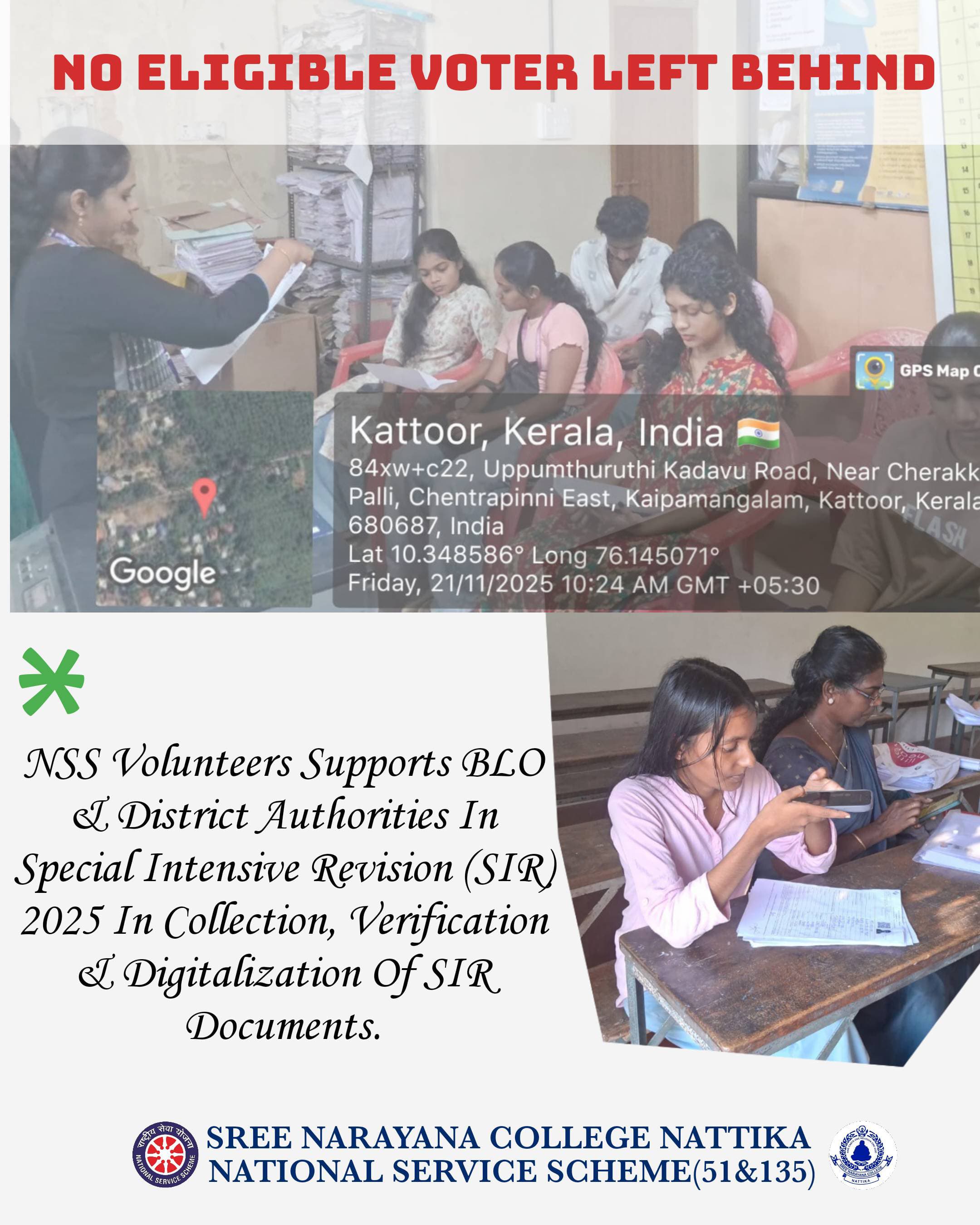 The NSS units of Sree Narayana College, Nattika, play a vital role in fostering social responsibility and community engagement among students. With two active units, the NSS regularly organizes impactful programmes focusing on green initiatives, effective waste management, blood donation camps, anti-narcotic awareness, and sustainable development. Through these activities, NSS volunteers develop leadership skills while making meaningful contributions to society.